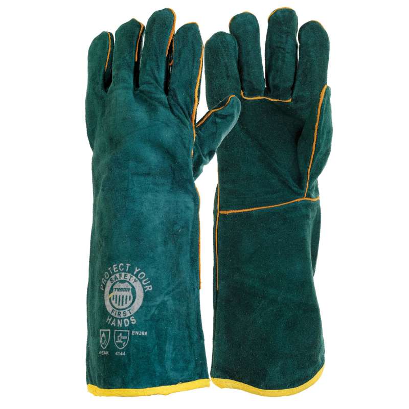 Fully weltedGreen dyed split leatherHigh abrasion & heat resistantSuitable for welding
